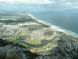 From Muizenberg Peak, there is a layered view featuring water: Zandvlei in the foreground; Marina da Gama - a housing development built on the water in the 1970s; and the sewerage works in the far distance.